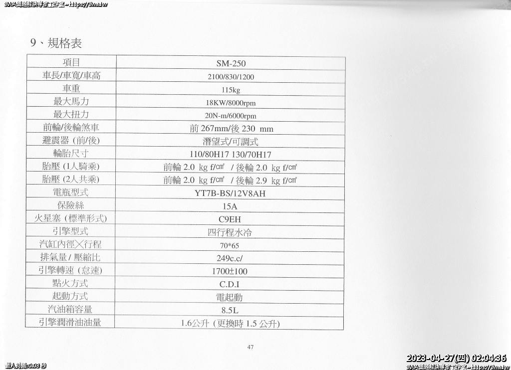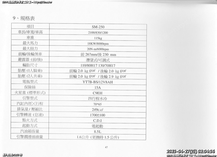 | 內容說明:SM250車主手冊 | 瀏覽人數: 1863 |